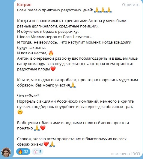 Духовная Экономика открыла Анне новые горизонты понимания финансов, превратив их в инструмент для духовного роста. Откладывание денег стало для нее не просто привычкой, а настоящей опорой в трудные времена. Это учит нас, что помощь может прийти оттуда, откуда мы ее не ожидаем. Духовная Экономика представляет собой путь к гармонии между духовными и материальными аспектами жизни.