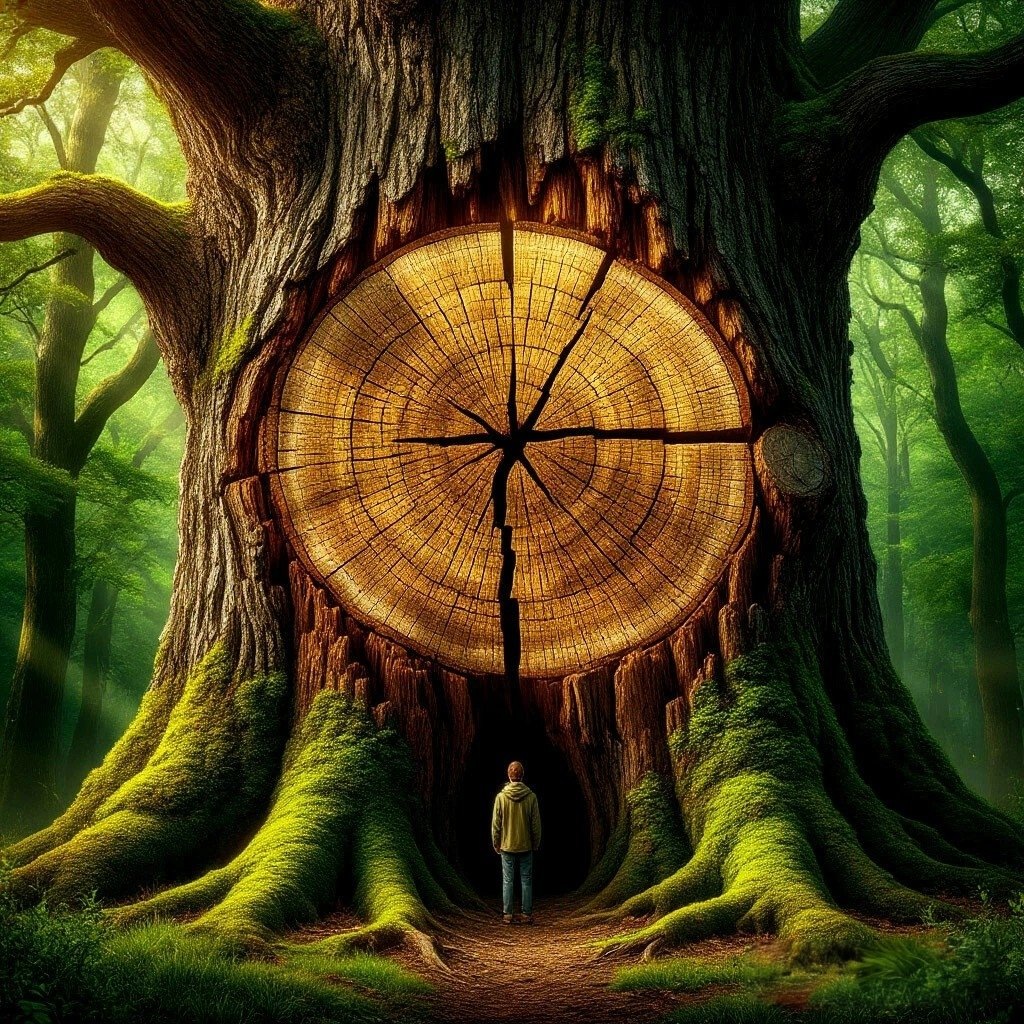 — Смотри, — произнёс он. — Эти широкие и светлые кольца говорят о годах благополучия. А тёмные и узкие полосы — это годы борьбы: голода, засухи, морозов. Ты рос не вверх, а вниз, углубляясь, искал воду там, где другие сдались. Каждое кольцо — не шрам, а символ стойкости.