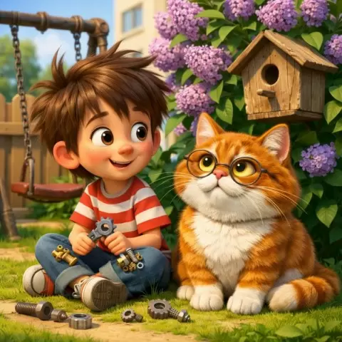 На одном тихом дворе, где весёлые качели покачивались под дуновением ветра, а старый скворечник прятался под густыми листьями сирени, жили два неразлучных друга: Миша и Котлета. Да-да, именно Котлета! Это был не просто кот, а настоящий философ с пушистыми усами и янтарными глазами. Миша — это мальчик с неукротимыми волосами и карманами, полными гаек и винтиков.