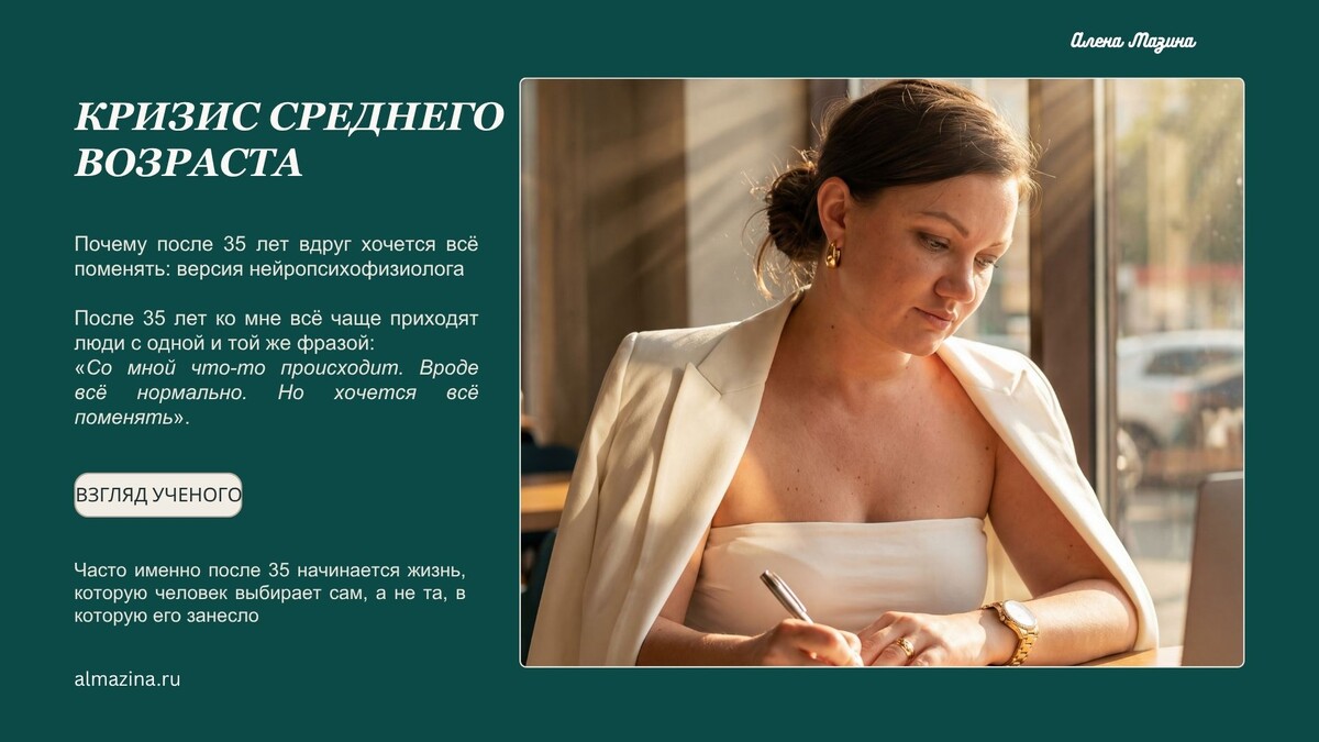 Это не кризис, а пробуждение. Начиная с 35 лет, многие впервые начинают открывать свою истинную суть и желание. В итоге возникает потребность в:
